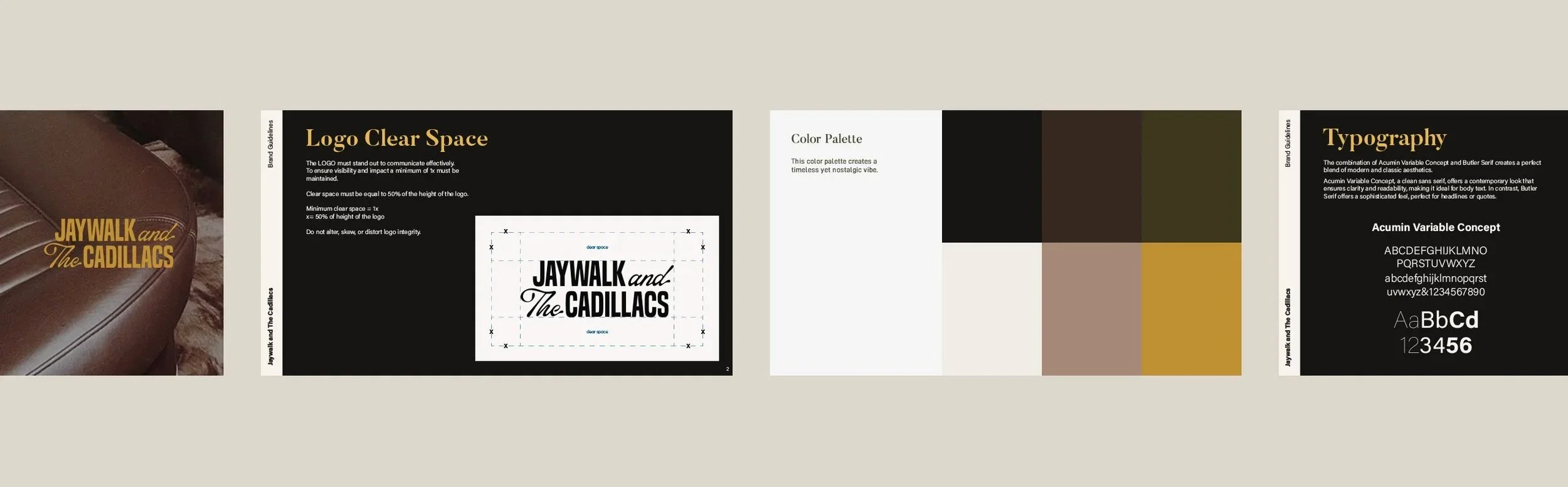 The branding balances past and present, with bold lettering and flowing script for strength and style. Gold, warm browns, and natural tones nod to vintage design, while photography and video create moods that feel classic yet contemporary. Together, the music and branding honor an era of passion and originality while building a distinct, modern identity.